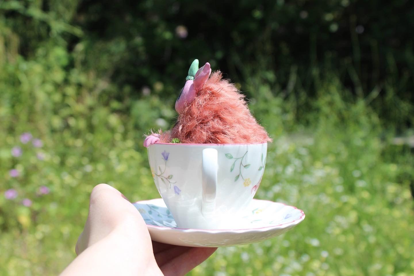 pictured is Petunia, Petunia has found her home in a lovely cream antteacup and saucer with cute flower details 🥰 she has a baby pink face and leaf green horns, raspberry coloured fluffy fur and wears her favourite cog around her neck.